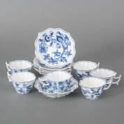 Zes porseleinen theekop-en-schotels met Zwiebelmuster en accoladerand, Meissen, Duitsland, midden 19e eeuw -meerdere restauraties en defecten-