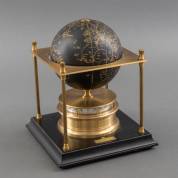 Messing klok in de vorm van een roterende globe op zwart houten basement, model Royal Geographical Society World Clock, uitvoering Imhof, inclusief doos, 27,5 × 22,5 × 22,5 cm