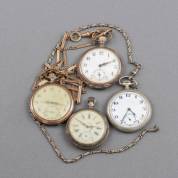 Vier diverse verzilverde en onedele zakhorloges, één aan zilveren horlogeketting