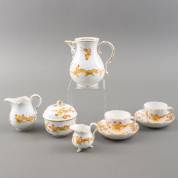 Polychroom beschilderd porseleinen theeserviesje met decor Yellow Court Dragon, uitvoering Meissen, begin 20e eeuw, bestaande uit: theepot, roomstel, klein kannetje, en twee kop-en-schotels -minieme defecten aan de bloem op het suikerpotje, deksel theepot ontbreekt-