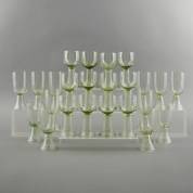 Twaalf lichtgroene glazen roemers met braamnoppen, en twaalf gelijkende glazen met smallere maar hogere kelk, tweede helft 20e eeuw -sommige met incompleet glasdraad op voet-