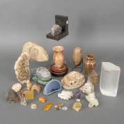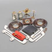 Divers kleingoed: negen witte aardewerk pijpjes, messing miniatuurklaptafeltje, drie ronde lijstjes, drie kleine fotolijstjes, meetlint in de vorm van een varkentje, roggenlederen portefeuille, en een pijpje van natuursteen en koper in foedraal