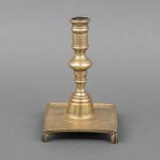 Messing kandelaar met baluster in de stam, staand op vierkante voet, Spanje, 17e eeuw, 18 × 12 × 12 cm