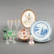 Divers kleingoed: kleurenlitho met voorstelling van Napoleon te paard, twee Chinees porseleinen borden met blauw-wit decor -defect-, vier schoteltjes met melk-en-bloed decor, porseleinen kandelaartje, uitvoering Meissen, en zeven diverse glazen, litho 19 × 14,5 cm
