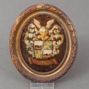 Ovaal lijstje met een heraldisch wapen: twee kwartieren met vissen en twee kwartieren met leeuwen, daaronder het opschrift 'Pieter de Sel', olieverf op tin, 19e eeuw -beetje verfverlies-, 10 × 8 cm