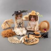 Twee antieke poppen met biscuit hoofd, blauwe ogen en open mond met tandjes, en zes hoedjes, twee parasols, waaier en pruik, begin 20e eeuw -defecten-
