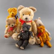 Zes oude mohair teddyberen, waaronder een donkere, diverse afmetingen en leeftijden -bespeeld-, grootste 45 cm