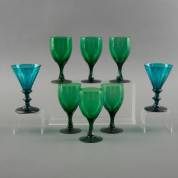 Zes groene wijnglazen met gefacetteerde stam, 13 × Ø 6 cm, daarbij: paar meerblauwe parapluglazen