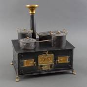 Metalen kinderfornuisje met toebehoren, eerste helft 20e eeuw -gebruikssporen-, 37 × 33 × 24 cm