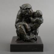 Bronzen beeld: moederaap met jong, niet gesigneerd, op zwart natuurstenen basement, modern, afmetingen inclusief basement 23 × 15,5 × 15,5 cm