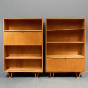 Twee berkengefineerde open boekenkastjes, beide met een klep, ontwerp Cees Braakman, uitvoering Pastoe -beide met meerdere gaten in een zijkant geboord, fineerschades-, beide 134 × 88 × 33 cm