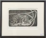Molly Kooijmans-Roukens (1926-1996), liggende kat in stoel, ets, r.o. gesigneerd en gedateerd '75, 9,5 × 16 cm