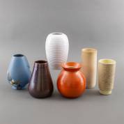 Zes keramiek vazen, diverse merken: Mobach, Adco, Zaalberg, Nagtegaal, en Flora Gouda, hoogte blauwe vaas 18,5 cm