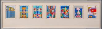 Collage van zeven miniatuurschilderijen, deels met thema de spoorwegen, olieverf op papier, alle gemonogrammeerd 'J.E.', laatste kwart 20e eeuw, maat met lijst 20,5 × 70,5 cm