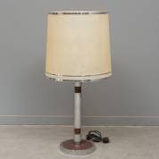 Tafellamp met verchroomde en bruine faux lederen voet, en perkamentachtige kap, jaren '70, 86 × Ø 40 cm