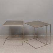 Paar rvs bijzettafeltjes, ontwerp Rodolfo Dordoni Leger, uitvoering Minotti -gebruikssporen, beschadigingen aan blad-, 52 × 50 × 50 cm