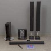 Bang & Olufsen geluidssysteem, bestaande uit: paar slanke actieve luidsprekers BeoLab 8000 Mk. 1, type 6801; brede actieve luidspreker voor wandmontage BeoLab 3500, type 1601; BeoSound Ouverture, type 2631; standaard voor de Ouverture met cd-vakken; en Beo4 afstandsbediening -luidsprekerkabels (powerlink/masterlink) ontbreken, dus geluid niet getest; de Ouverture gaat aan, lampjes branden, cd-lader werkt, cd gaat draaien; BeoLab 3500 gaat aan en reageert op commando's van knoppen en Beo4-