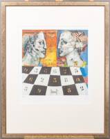 Astrid Engels (1941), twee hoofden boven een spelbord, litho 97/125, r.o. gesigneerd, 46 × 46 cm