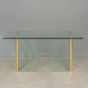 Glazen wandtafel met messing koppelstukken -enkele chipjes van bladrand en enkele krasjes op messing-, 72 × 140 × 60 cm