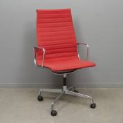 Stoel met rood stoffen bekleding op vast aluminium onderstel met wieltjes, ontwerp Charles en Ray Eames, uitvoering Herman Miller -gebruikssporen-