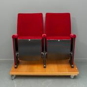 Paar aan elkaar verbonden houten theaterstoelen met rode velours bekleding, genummerd rij 1, stoel 32 en 34, gemonteerd op houten onderplaat, staand op een los verrijdbaar plateau, herkomst: Leidse Schouwburg, afmetingen zonder verrijdbaar plateau 101 × 121 × 61 cm