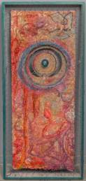 Abstract wandsculptuur, diverse stofsoorten gespannen in raamwerk, vermoedelijk derde kwart 20e eeuw -enkele spandraden defect-, 132 × 60 cm