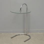 Bijzettafeltje met rond glazen blad hangend aan verchroomd buisframe onderstel, uitvoering Ikea, modern, 70 × 40 × 43 cm