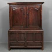 Eiken tweedeurs kast, mariage van 18e-eeuwse 'mule chest' en mogelijk eveneens 18e-eewse bovenkast, de onderkast volledig gesloten en alleen te gebruiken van binnenuit, Engeland, 182 × 138 × 54 cm