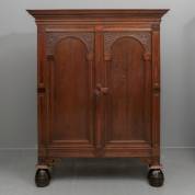 Eiken Utrechtse poortkast met palissandergefineerde elementen, staand op twee gezwarte aardewerken bolpoten, 17e eeuw -herstellingen en defecten-, 194 × 152 × 61 cm
