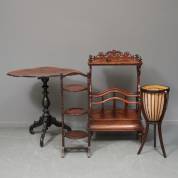 Bloemmahonie tafel met galerijranden, de etagère met rekken voor kranten en tijdschriften, mahonie bijzettafel op driespantpoot en ingelegd blad, 19e eeuw, eiken bordendrager, Engeland, en met stof beklede mahonie jardinière op driespantpoot, 20e eeuw -één galerijrand los bijgevoegd, gebruikssporen-, hoogte bijzettafel 74 cm