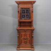 Mechelse eiken kast met snijwerk, de opstand met glas-in-looddeur, 20e eeuw, 230 × 99 × 55 cm