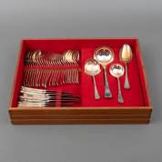 Zespersoons verzilverd bestek met vierdelig diengerei, uitvoering Gero, Zeist, in houten cassette, 9 × 48 × 38 cm