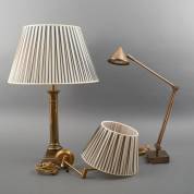 Bronskleurige zuilvormige metalen lampvoet met groen-rood gestreepte geplisseerde kap, daarbij: twee diverse bronskleurige metalen wandlampjes waarvan één met gelijkend kapje, hoogte lampvoet inclusief kap 68 cm