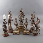 Driedelig onyx en zamak klokkenstel -defecten-, daarbij: vier diverse zamak beelden -één met gelijmde arm- en twee messing wandlampjes met glazen kapjes, hoogte klok 64 cm