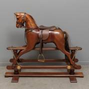 Mahonie hobbelpaard met afneembaar leren zadel en leren tuigage, de manen en staart van echt paardenhaar, uitvoering Peverel, Engeland, eind jaren '90 -manen en staart versleten, hout licht verkleurd-, 100 × 120 × 37 cm