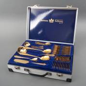 Verguld stalen bestekgedeelte, model Rococo, uitvoering SBS Sölingen, Duitsland, jaren '70, bestaande uit: elf dinervorken, twaalf dinerlepels, twaalf dinermessen, elf dessertvorken, twaalf dessertlepels, soepdienlepel, sauslepel, twee groentedienlepels, compotelepel, taartschep, suikertang, twee vleesvorkjes en schepje, 23/24kt verguld, in originele koffer