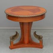 Mahonie bijzettafeltje met bronzen beslag in de vorm van Griekse sfinxen, empirestijl, midden 20e eeuw -onderstel mist poten-, 69 × Ø 76,5 cm