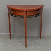 Mahoniegefineerd halvemaantafeltje met galerijrandje tussen de poten, het blad en de ladefronten ingelegd met geblokte biezen, Louis Seize-stijl, tweede helft 20e eeuw, 75 × 70 × 36 cm