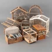 Negen houten vogelkooien -in gebruikte staat-, hoogte grootste 49 cm