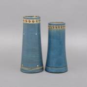 Twee keramiek vazen met zeeblauw glazuur en decoratieranden, de ene vaas in klei gestempeld K. Mobach en ingekrast met 35, de andere vaas met ingekrast 36, circa 1915 -één met twee minieme chips langs de rand-, hoogte grootste vaas 28,5 cm