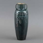 Donkerblauwgeglazuurde aardewerk vaas met hartvormig decor in reliëf, uitvoering De Kat, Bergen op Zoom, 1902-1918 -klein chipje van standring-, 28 × Ø 10 cm