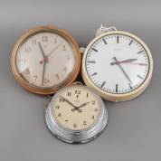 Drie elektrische wandklokken: één in eiken kast, adres: Nufa, één in metalen kast, adres: van Doorn, en één in verchroomde kast, adres Elsa, diverse periodes -kleine defecten, niet getest-, Ø 30 cm