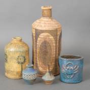 Vijf vaasjes: twee door Rien Wensma (1920-2007), beide gesigneerd, de grote gedateerd '78, de kleine '98, grootste 34 cm hoog, twee uitvoering Mobach, en één met onbekend monogram