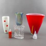 Zes stuks modern glaswerk: vijf diverse vazen, en één conische presse papier, alle tweede helft 20e eeuw -kleinste vaasje met chipje-, 34 × 32,5 × 21 cm