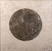 Abstract schilderij: donkere cirkel op witte achtergrond, plakkaatverf op doek, niet gesigneerd, tweede helft 20e eeuw, 80 × 80 cm