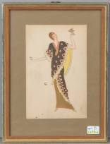 Maria Likarz (1893-1971), vrouw met roos in sierlijk gewaad, kleurenlitho, gemonogrammeerd in de druk, Wiener Werkstätte, 14 × 9 cm