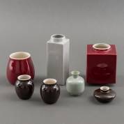 Zeven diverse monochrome porseleinen vaasjes, voornamelijk uitvoering St. Maarten Porselein, Utrecht/Rhenen, jaren '50/'60, afmetingen vierkante rode vaas 12,5 × 9 × 9 cm