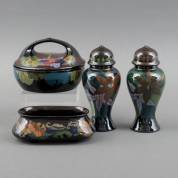 Vier stuks glansplateel, bestaande uit: twee dekselvaasjes, uitvoering Plateelbakkerij Schoonhoven, bedekte schaal, uitvoering Ivora, en ovaal bakje, uitvoering Plateelbakkerij Zuid-Holland -vazen met chips van onderrand en op puntje van deksels-, vaasjes 19 × Ø 8 cm