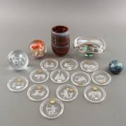 Twee glazen presse-papiers, de ene met ingeblazen bloemdecor, de ander met bellen, kristallen asbak, ontwerp Max Verboeket, uitvoering Kristalunie, Maastricht, twaalf kristallen onderzetters met geëtst decor: sterrenbeelden, uitvoering Val St. Lambert, België, glazen presse-papier met iriserend golvend decor 'Orient & Flume', 612 O 1975 KA, en glazen vaas met horizontale, polychrome glasdraden, asbak Ø 17 cm