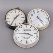 Drie elektrische wandklokken: één in zwarte kast, adres: Paauwes' Synchroon, één in witte kast met reclametekst: Lincoln Horloges, en één in witte kast, adres: van Doorn, circa 1970 -kleine defecten, niet getest-, Ø 30 cm